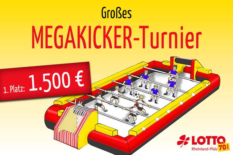 Im Rahmen des LOTTO-GLÜXFEST, dem Sommerfest bei Lotto Rheinland-Pfalz, findet am 23. Juni ein großes MEGAKICKER-Turnier statt. In der Megakicker-Arena treten pro Team jeweils fünf Spieler – davon ein Torwart – gegeneinander an. Gespielt wird wie beim Tischkicker, nur dass nicht kleine Figuren sondern echte Menschen an den Stangen im Spielfeld gegen den Ball treten. In vier Gruppen sind jeweils drei Mannschaften am Start, die die Gruppensieger ausspielen. Die Gruppensieger spielen dann im Halbfinale und Finale um hochwertigen Preise: