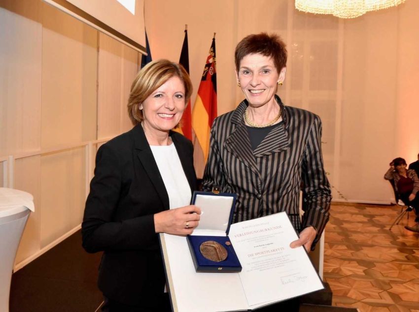Dass sie selbst in den Genuss einer solchen Ehrung kommt, ist für Karin Augustin – die unzählige Sportler und Funktionäre ausgezeichnet und in hohen Tönen gelobt hat – noch immer ein wenig ungewohnt. „Eine Rolle, die ich nicht so ganz gerne einnehme“, verriet die frühere Klasse-Handballerin. Was sie für Sport habe leisten können, sei „nur deshalb möglich gewesen, weil ich so tolle Mitstreiter hatte. Für mich ist es ein bewegendes Gefühl, in diesem Kreis und in diesem tollen Rahmen diese Ehrung annehmen zu dürfen“. Ausdrücklich bedankte sich Karin Augustin bei Herbert W. Hofmann, der bei der Feierstunde ebenfalls anwesend war. Ihr Vorgänger als Präsident des Sportbundes Rheinhessen sei für sie ein „väterlicher Freund und Förderer“ gewesen. „Er hat mir gesagt, dass man in bestimmte Ämter hineinwächst.“ Dank solcher Unterstützer und Ermunterer sei es ihr nicht allzu schwer gefallen, sich als Dame unter lauter Männer-Funktionären zu behaupten. Dass sie inzwischen deutlich mehr Zeit habe für Freunde und Familie, genieße sie sehr – auch wenn sie das Abschneiden der RLP-Asse natürlich nach wie vor interessiert verfolgt.